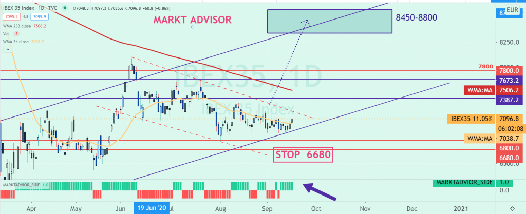 Cabe decir que a esta hora, las 11,31h de este 16 de Agosto 2020 el IBEX marca ya los 7086 puntos, y está dentro de la franja que venimos trabajando, que es la zona comprendida entre 7058-7140.