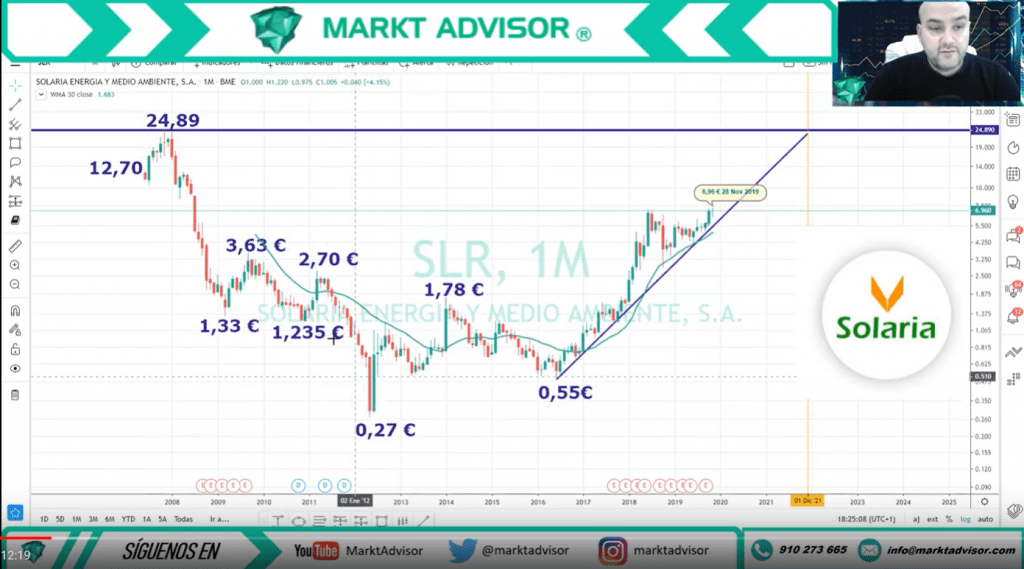 Te explicamos en el vídeo además los objetivos alcistas que vemos para SOLARIA hasta 2021. Y vigilad por debajo la media de 30 sesiones en gráfico mensual y que no se pierda, mientras no se pierda hay que estar ahora comprado en el valor.
